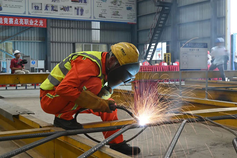 紧接着,来自中铁十二局、中铁十一局、中铁大桥局、保利长大等施工单位的焊接高手们轮番上阵。他们全副武装,手持焊枪,神情专注。一时间,作业区内弧光闪烁、焊花璀璨,选手们沉稳操作,尽显精湛技艺与严谨态度。